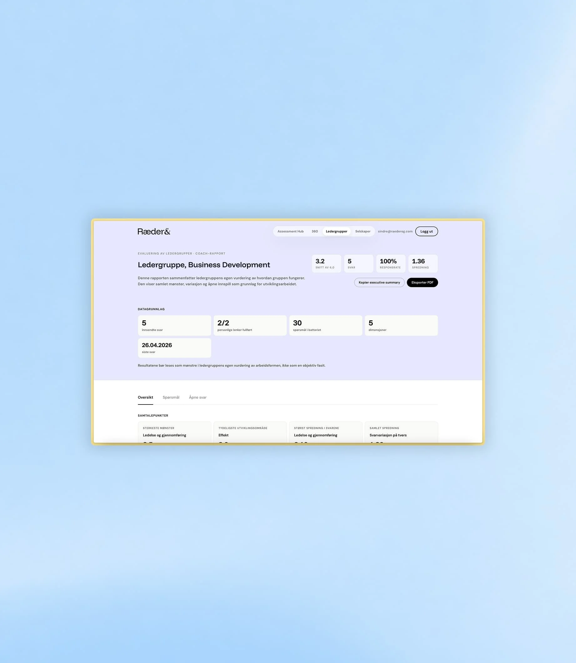 Vi samler strukturerte datapunkter på hvordan ledergruppen faktisk fungerer i praksis. Det gir et objektivt utgangspunkt for dialog, prioriteringer og tiltak.